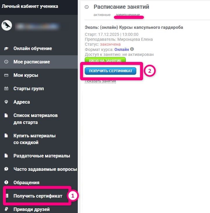 Сертификат можно получить в личном кабинете ученика